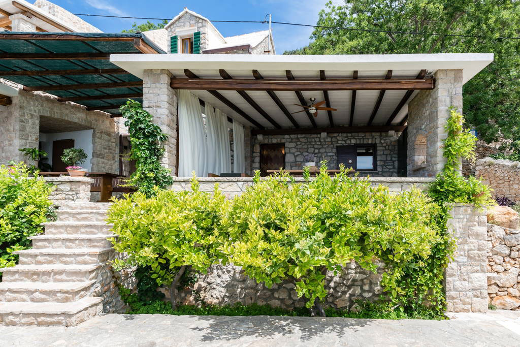 It is a house with one bedroom, kitchen with dining area, bathroom and hall. Bedroom has a double bed and one single bed and one couch/sofabed for one adult. It is ideal for a five members family. The house has access to a large terrace with beautiful sea view.